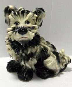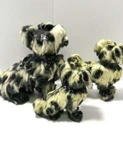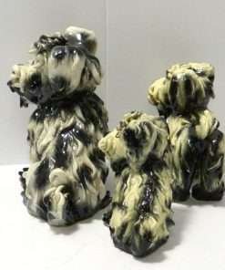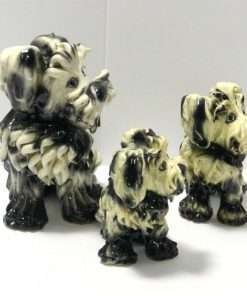 The largest of the three measures a full 7″ tall x 6″ long x 3 3/4″ wide. The medium sized dog measures 5″ tall x 5″ long x 3 1/4″ wide. The smallest of the three measures 4 1/4″ tall x 4 1/4″ long x 2 3/4″ wide.