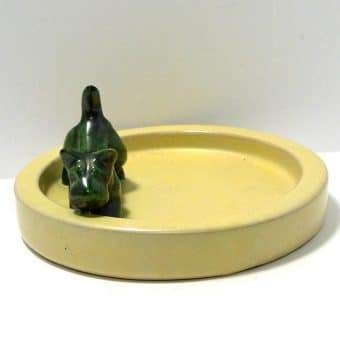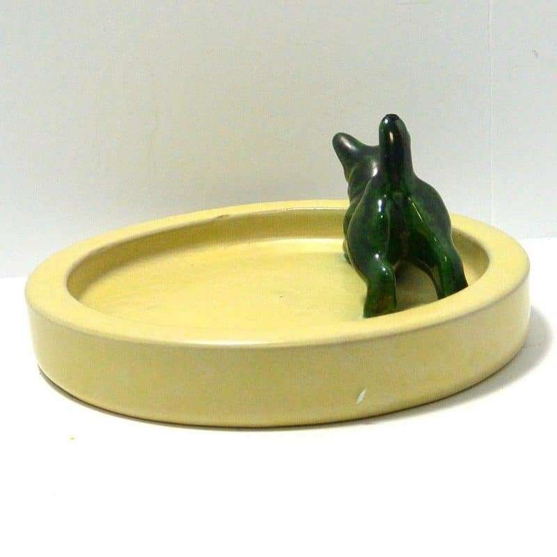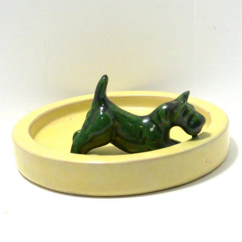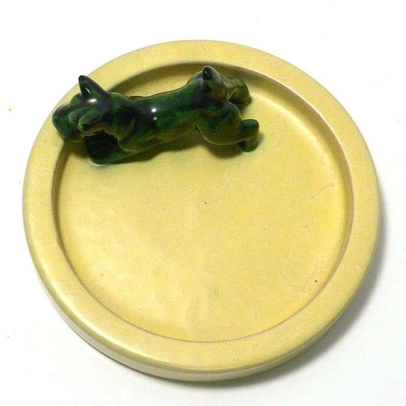This sleek dish has a wonderful mid-century modern appeal. Made by Upsala Ekeby, (1886- 1984)in the early 1960’s, it sports a sweet Scottish Terrier dog who looks ready to pounce. The Scottie measures 2 1/2″ tall x 3 3/4″ long x 1 1/4″ wide. He is done with a gorgeous color swirl of green, black and a greenish gold. He stands off to one side of a round, lemon yellow dish that is 6 1/2″ in diameter. The entire piece is in excellent condition. It is clearly marked “EKEBY” on the underside.