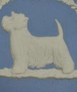 This Wedgwood, covered trinket dish features a full body portrait of a Scottish Terrier dog.