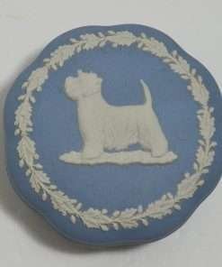 This Wedgwood, covered trinket dish features a full body portrait of a Scottish Terrier dog.