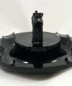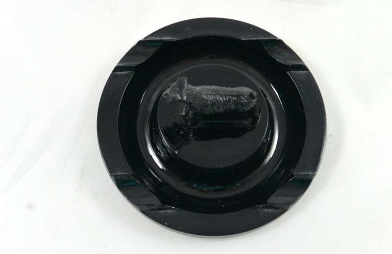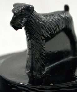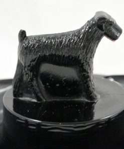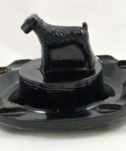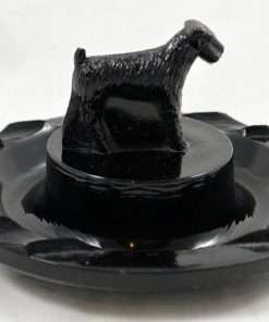 Nothing is more elegant than basic black, and this Art Deco dog ashtray is a study in simplicity and elegance. It was created by Greensburg Glass Works in the mid-1920’s – 1930’s, and features a highly-detailed Wire-Haired Fox Terrier. It is done in what was called ebony glass, with a very smooth, high gloss finish. It is 4″ in diameter, and the dog is 1″ tall x 1 1/2″ long x 1/2″ wide. It is in excellent condition, with no signs of wear, which is outstanding, considering it’s age. Despite its original purpose, it can easily be re-purposed as a dish to hold cufflinks, rings, coins, etc…A fabulous gift for a very “classy” guy!