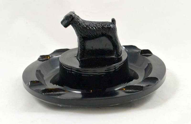 This Art Deco dog ashtray is a study in simplicity and elegance. It was created by Greensburg Glass Works in the mid-1920’s – 1930’s, and features a highly-detailed Wire-Haired Fox Terrier.