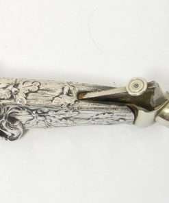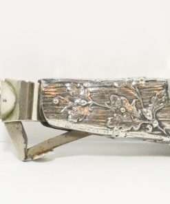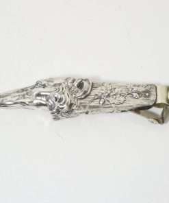 Measuring 1″ tall x 6″ long x 1 1/4″ wide, this antique cigar cutter is in extraordinary condition, with only very mild wear of the silverplate.