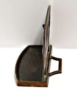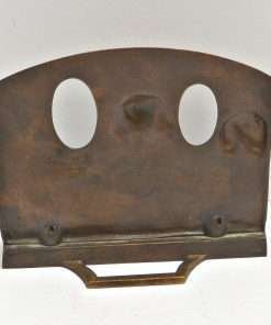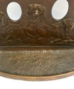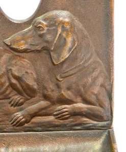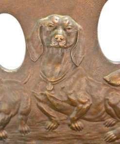 This antique, solid bronze pipe tray and bookend has three wonderful Dachshund dogs on the front in high relief. Each one is different, and each absolutely shows a distinctly different personality. The casting is crisp and highly detailed. The base has a shallow tray in front which is also decorated, that was used to support two pipes with their ends extending through the holes between the dogs. The back of this piece also has an extension that can slip under a book, so that the piece functions as a very sturdy, heavyweight bookend. It measures 5″ tall x 6″ long x 4″ wide. It is in wonderful condition, having been made in the early 1900’s. This Dachshund pipe tray and bookend is so unique and charming. The front tray, of course, can be re purposed to hold loose change, stamps, or paperclips on a desk.