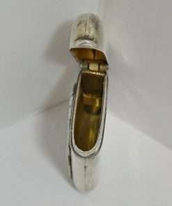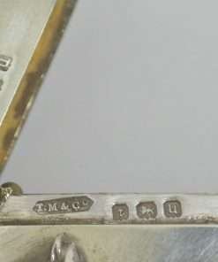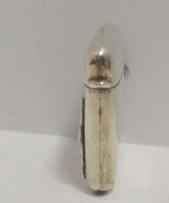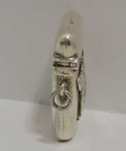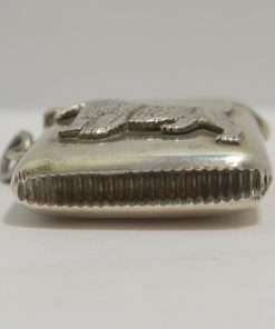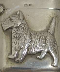 The hallmarks for this piece are clearly stamped on the front of the lid. Unique, and rare, this match safe or vesta case has a highly detailed relief of a Scottish Terrier dog. The textured striker portion along the bottom is in excellent condition. It has it’s original, round hoop attached, and the lid opens and closes quite well. It is 1 3/4″ tall x 1 1/4″ wide, and with the exception of some mild scratching, it is in excellent overall condition.