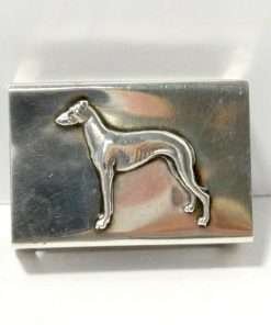 This antique, sterling silver matchbox has a wonderful Doberman Pinscher dog on the front that is presented without the more typical docking of the dog’s tail, and the cropping of his ears.