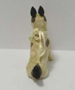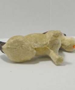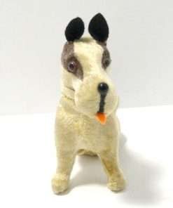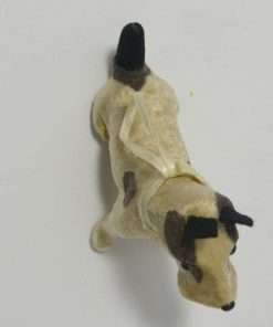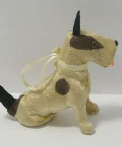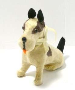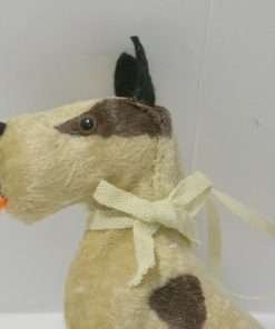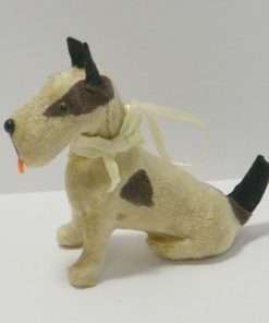 This sweet, flocked mohair terrier dog looks to be a Fox Terrier. He is made of bisque and flocked with mohair. He has beaded, two-tone eyes and a black beaded nose. His tongue is a bright red felt and his perky ears are made of black felt. He sits nicely at 41/4″ tall x 5 1/4″ long x 1 7/8″ wide and he is in excellent condition. He has a bow, and also a ribbon lead. This mohair terrier is not only a sweet, engaging little dog, he is also a wonderful addition to any mohair toy animal collection. He is so exquisite and so life-like, you will want to give him a very special spot in your heart, and in your home.