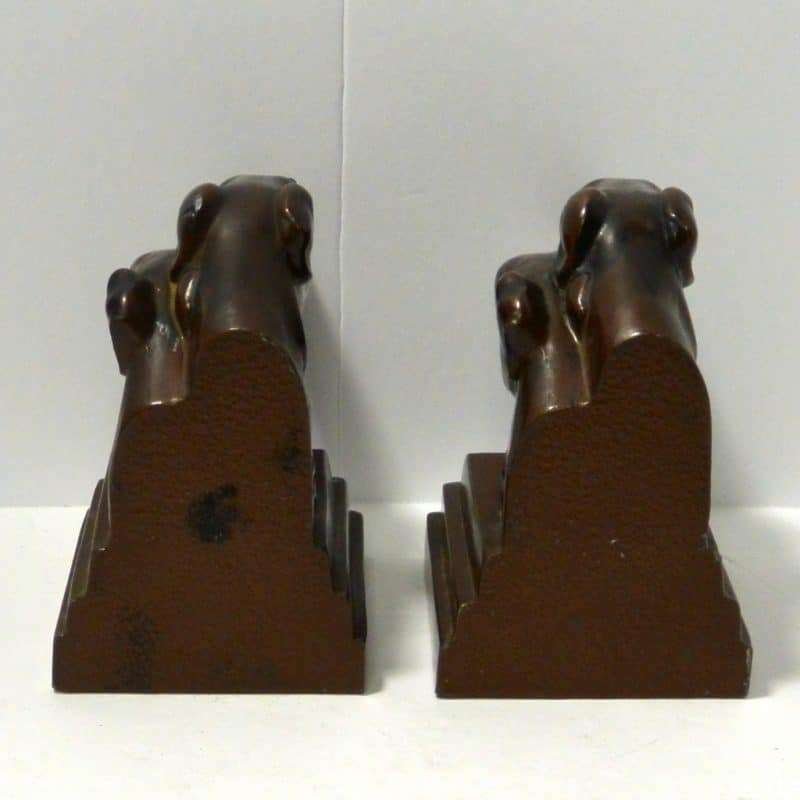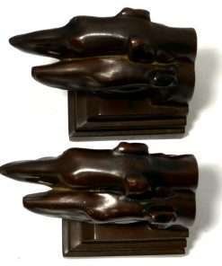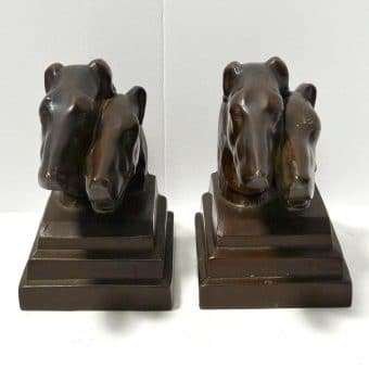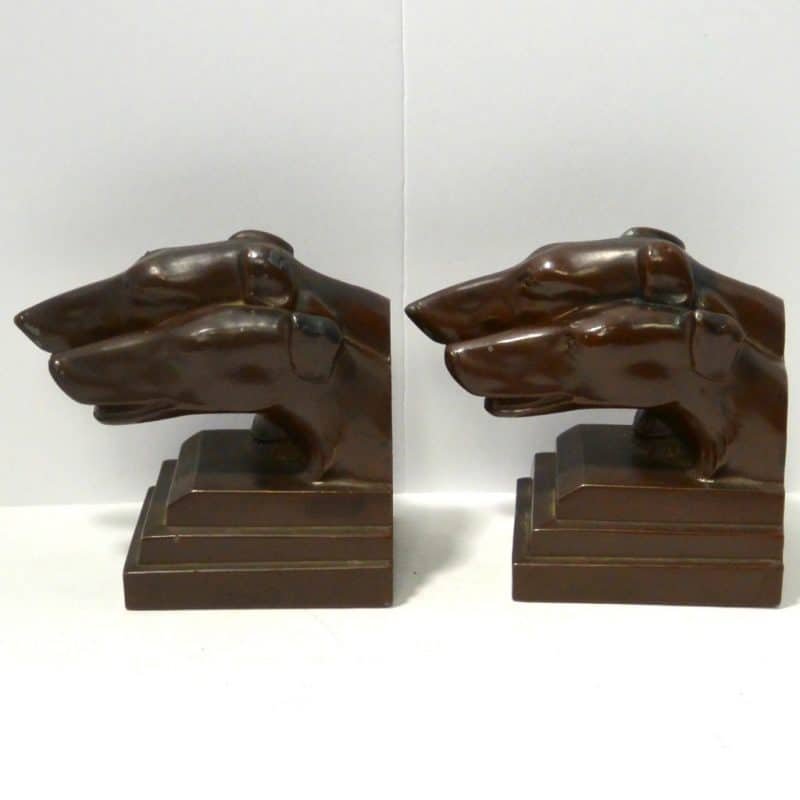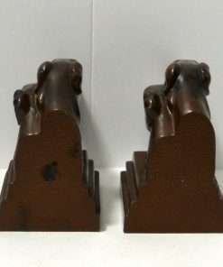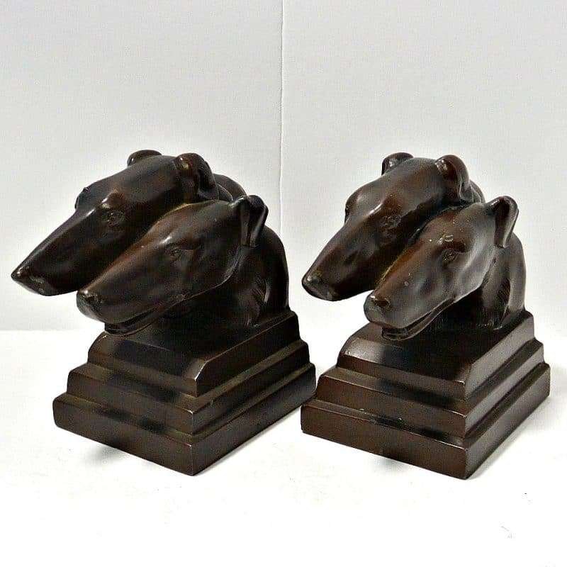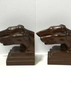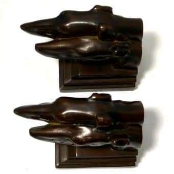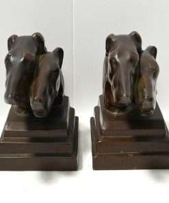 This pair of Borzoi Dog Head Bookends capture the bold and sleek look of Art Deco design to perfection. They were made in New York City by Nuart, and they are each signed “Nuart Creations Made in the USA.” They are made of heavy metal and then painted a gorgeous deep bronze color. Measuring 5 1/2″ tall x 5 3/4″ long x 3 1/4″ wide, they are in excellent condition with only the slightest few pinpricks of missing paint.