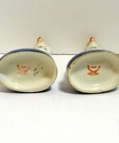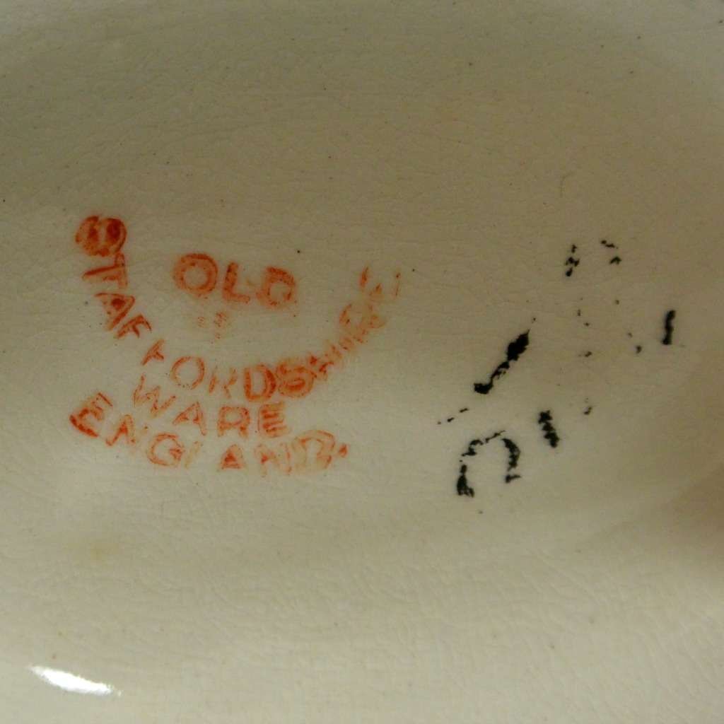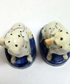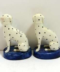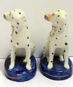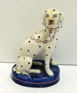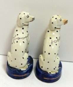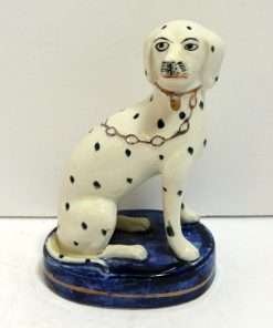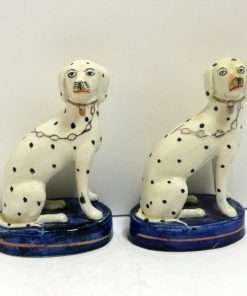 This elegant pair of seated, spotted dogs date back to the late-1800’s. Made in the Staffordshire region of England, these figurines were most likely intended to represent Dalmatians which were a popular breed at that time. At 51/2″ tall x 3 1/2″ long x 2 1/2″ wide, these dogs are in excellent condition. While the appeal of Staffordshire figurines is often in their charming folk style, depicting everyday life in the English countryside, this pair also will add a very elegant and more formal touch to your home. They are seated on cobalt blue, oval bases, while their locked collars and linked leads are painted gold. They carry characteristics that identify them from the late 1800 – the early 1900 time period. Like many dog pairs from that time period, they are a matched set, yet not identical. As you can see, for example, the muzzle of one dog is colored in a flesh-tone beige, while the other is pure white. Each has a tiny firing hole on its side, but neither have the casting holes that appear in much later reproductions. Each one is marked “Old Staffordshire Ware England” in red, and one is marked with a number, in black that has worn off enough to render it indecipherable.