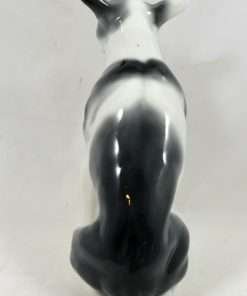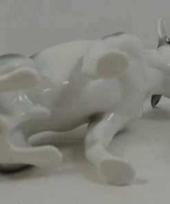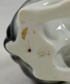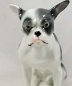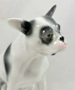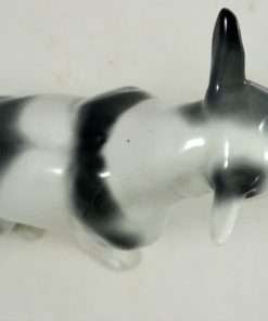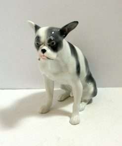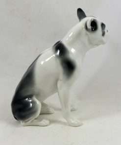 This very elegant, figurine of a Boston Terrier was created by G. Fritz Pfeffer, a very well known modeler of fine porcelain, who established his factory in Gotha, Thuringia, Germany in 1892. This gorgeous Boston Terrier bears the GP stamp, used between 1900 and 1934. Done in a beautiful palette of soft black and greys, against a bright white background, he has the slightest touch of pink on his muzzle and very expressive, two-tone eyes. He is in excellent condition and sits 5 1/2″ tall x 3 3/4″ long x 2 1/2″ wide. If you are a Boston Terrier owner or lover, this elegant example of the breed would make an amazing addition to your canine porcelain collection.