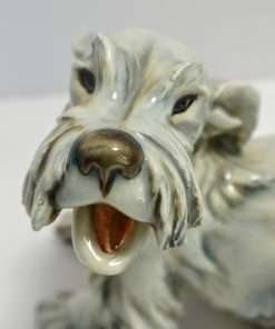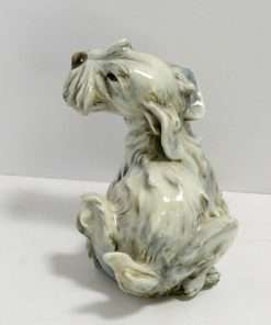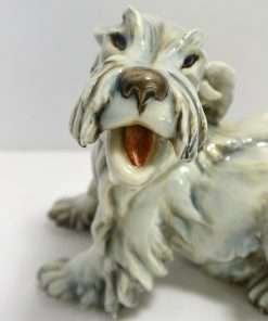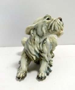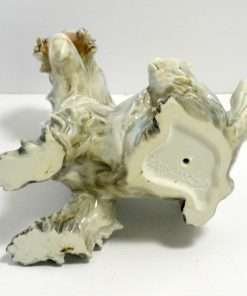 This amazing Maltese pup has all the characteristics of a dog designed by the famous Italian artist Guido Cacciapuoti (1892-1953). It has an impressed signature of the artist on the bottom. As always with a Cacciapuoti dog, this pup has a very expressive face and posture, as well as a wildly sculptural quality to its fur. We like to refer to it as “wildly animated” as though the dog was caught and frozen in motion. It has a beautiful high gloss finish in soft hues of vanilla and grey, with a deep rosy tongue, a taupe/brown nose and black eyes. He measures 5″ tall x 5 1/2″ long x 3 1/2″ wide. This amazing pup is in excellent condition. If you are a Cacciapuoti collector, don’t miss out on this one. If you are looking for a truly engaging pup, this might be just the one you have been searching for!
