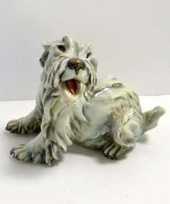 This amazing Maltese pup has all the characteristics of a dog designed by the famous Italian artist Guido Cacciapuoti (1892-1953). It has an impressed signature of the artist on the bottom. As always with a Cacciapuoti dog, this pup has a very expressive face and posture, as well as a wildly sculptural quality to its fur. We like to refer to it as “wildly animated” as though the dog was caught and frozen in motion. It has a beautiful high gloss finish in soft hues of vanilla and grey, with a deep rosy tongue, a taupe/brown nose and black eyes. He measures 5″ tall x 5 1/2″ long x 3 1/2″ wide. This amazing pup is in excellent condition. If you are a Cacciapuoti collector, don’t miss out on this one. If you are looking for a truly engaging pup, this might be just the one you have been searching for!