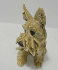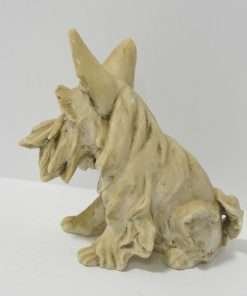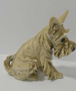 Given the age of this extraordinary dog, the Italian artist, Guido Cacciapuoti, most likely fashioned him after a Scottish Terrier. However, for those of us who love Maltese as well, you can easily see how this dog could be very well be a Maltese in both appearance and personality! The detailing on this porcelain is amazing, from the animated look in his eyes, to the wild “movement” of his fur. At 4″ tall x 4″ long x 2 1/4″ wide, it is in great condition, with some wear in spots on its original paint.