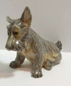 This Scottish Terrier pup by Dahl Jensen is absolutely exquisite! As with all Dahl Jensen figurines, his expression is so gentle and sweet, you can’t help but want to hold him! He sits a full 6″ tall x 8″ long x 3 3/4″ wide and looks at you with such soulful eyes, that you can almost feel your heart melting. He is clearly marked #1078 and he is in excellent condition. The white spots you may see in the pictures are just “tricks” of lighting and the camera…he is flawless. Please note that the pictures make him look more “brown” in color than he actually is. His true coloring is more of a soft grayish brown. If you are a collector of Dahl Jensen figurines, this beautiful Scottish Terrier is the perfect addition to your collection. He appears on page 37 of “Dahl-Jensen Porcelain Figurines 1897-1985 by Caroline and Nick Pope. As a gift, or a decorative reminder of your favorite breed, he is priceless!