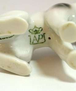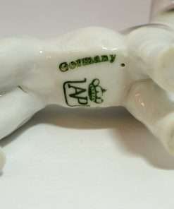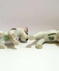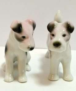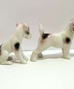 This pair of Wire-Haired Fox Terriers are in mint condition and so engaging! They have been together for so long, we thought that they should stay that way. They were created in the Mann & Porzellius Factory in Unterweissbach, Thuringia, Gemany between 1909 and 1936. They are both clearly marked “AP” (A. Porzellius) with a crown, and “Germany”, which could, in fact, date them as far back as 1882. The standing pup is 2 1/2″ tall x 3″ long x 1″ wide and the other pup sits at 2 1/2″ tall x 3″ long x 1 1/2″ wide. Together they make a perfectly matched and adorable pair.