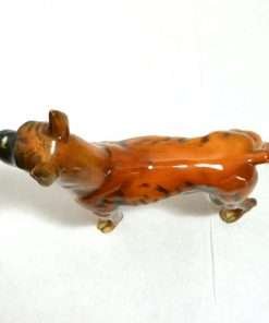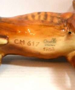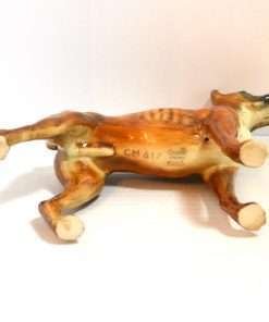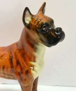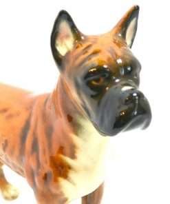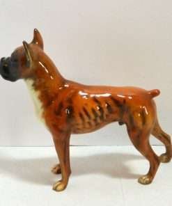 Standing alert and poised for action, this Goebel Boxer dog figurine is a full 7″ tall x 7″ long x 2″ wide. He is in excellent condition and is done in a gorgeous high gloss finish. The detailing is just wonderful with his white fur splaying along the edges of his broad chest, and his muscles rippling along his body, and down his legs. He is the perfect picture of this dog’s strength and determination. He is a classic example of this breed to add to your Goebel canine collection, and a great gift to any Boxer owner.