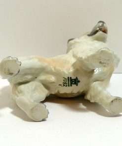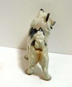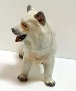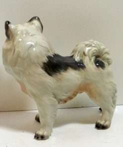 It is hard to find a porcelain dog that is more engaging than those designed by Jens Peter Dahl -Jensen. This exquisite Husky dog looks as though he has just noticed something or someone that peaks his interest and makes him smile! Such realism,(look at his teeth and tongue), combined with Dahl-Jensen’s signature soft color palette, places this vintage porcelain figurine in a class all its own! Standing 6 1/4″ tall x 6 3/4″ long x 3″ wide, this gorgeous dog carries the standard DJ crown mark on his underside, along with the #1082. Although we are calling him a “Husky”, he is in fact a Greenland Hound, which is a large Husky-type dog, close to a Canadian Eskimo Dog. The Greenland Hound is used primarily as a working dog, to pull sleds and to hunt polar bears and seals. This fabulous figurine shows this powerful dog at his very best…a confident, loyal and protective dog. He is in excellent condition and he appears on page 39 of “Dahl-Jensen Porcelain Figurines 1897-1985 by Caroline and Nick Pope. This figurine is large enough to stand alone as a wonderful, decorative piece, or make a very special gift for a Husky/Greenland Hound owner or lover! Interested in Dahl-Jensen canines? Please take a look at the others we have in our shop. This particular dog is one of the difficult of Dahl Jensen’s canines to find.