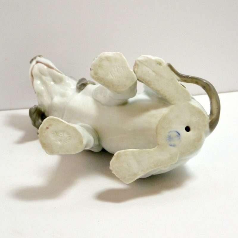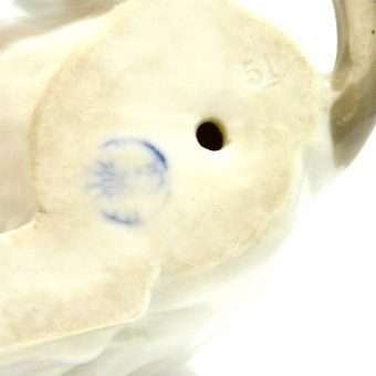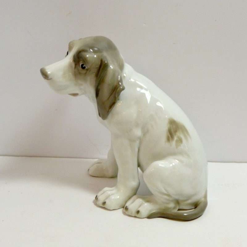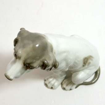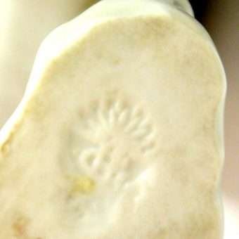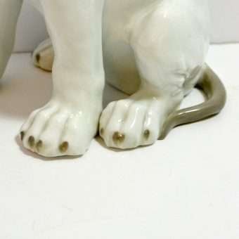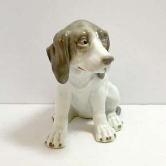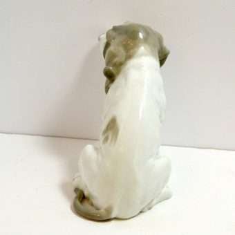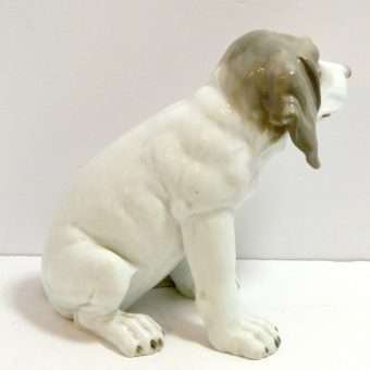 This large, enchanting, porcelain Pointer dog was made in the Gebruder Heubach Lichte Porcelain Factory sometime between 1890-1925. He is in excellent condition and sits a full 7″ tall x 6″ long x 4 1/2″ wide.