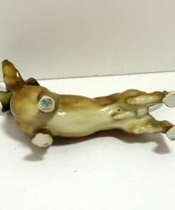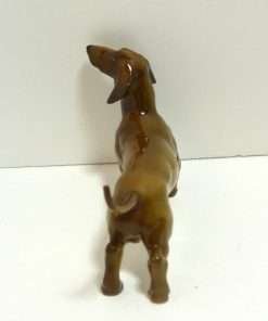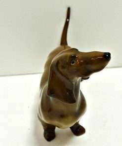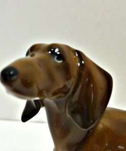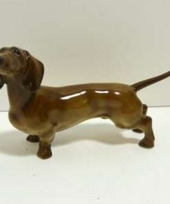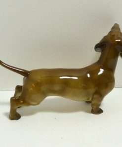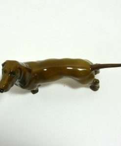 The beauty of this Hutschenreuther Dachshund dog figurine is in its realistic portrayal of this charismatic breed. With his tail raised, and nose lifted, this charmer looks straight at you with an intent and steady gaze, and your heart just melts! At 3 1/4″ tall x 5 1/4″ long x 1 1/4″ wide, he is in excellent condition. He is marked on the base of one foot with the green Hutschenreuther stamp with the lion in an oval, and “Germany” below the oval. Please note that any spots you may see are from the camera lights. This pup has such personality, he will surely be a favorite for any Dachshund enthusiast and collector.