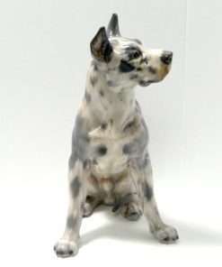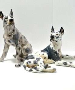 This exquisite, porcelain Harlequin Great Dane is surely one of the finest canine figurines created by Dahl-Jensen. Such realism, combined with Dahl-Jensen’s signature soft color palette, puts this vintage porcelain dog figurine in a class all its own. Seated at a full 10 1/2″ tall x 6 3/4″ long x 6″ wide, this gorgeous dog carries the standard DJ crown mark on his underside, along with the model #1111. He is in mint condition, and he appears on page 54 of “Dahl-Jensen Porcelain Figurines 1897 – 1985 by Caroline and Nick Pope.