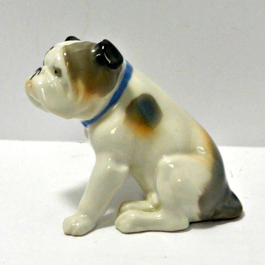 This porcelain Bulldog is full of character. Designed by Metzler & Ortloff of Thuringia, Germany (1875 – 1990), this sweet guy was made between 1972 and 1976. He sits 2 1/2″ tall x 2 3/4″ wide x 3 3/4″ long, and he is in excellent condition. The look on his face, that “Oh really, so what else is new?” is classic Bulldog and something that anyone who has had the pleasure of a Bulldog’s company knows well. He would fit in well in any Bulldog collection, and he would certainly make a wonderful gift to any Bulldog enthusiast.