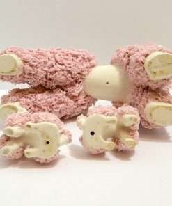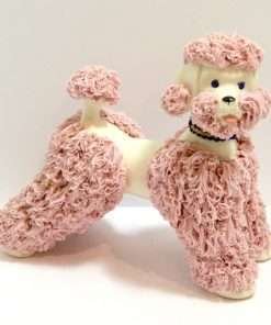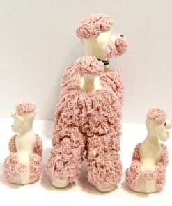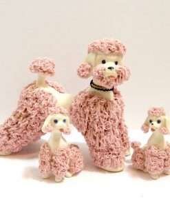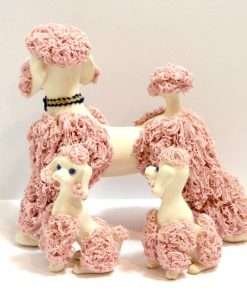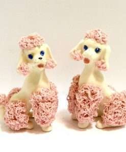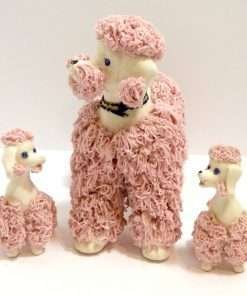 This elegant, mid-century trio is a spaghetti poodle collector’s dream. All three are in excellent condition, done in soft pink “spaghetti curls”, with snowy white bodies, and sparkling blue glass eyes.