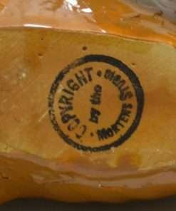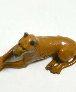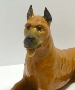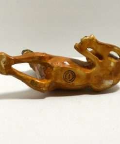 His overall, sleek, fawn painted coat is accented by a soft black muzzle, and ears. Measuring a full 5 1/4″ tall x 8 1/2″ long x 4″ wide, he is in great condition, with the exception of a spot of paint loss on the top of his head, and a rough spot on the lowest part of his chest (close to the underside of the dog.)