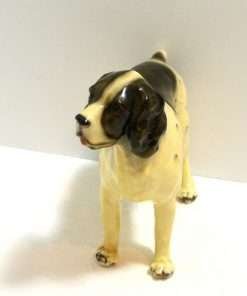 This wonderful Springer Spaniel dog was designed and produced by Mortens Studio. Seated at 4 1/2″ tall x 6″ long x 2 ” wide, he has fabulous detailing, and elegant black and white coloring (including the “freckles”.) The designer of this figurine, Oscar Morten, immigrated from Sweden to the U.S. and opened a giftware studio in Chicago in 1931. Over the next 32 years, he created over 300 popular dog and horse models. Composed of ceramic over a metal skeleton, these figurines, although beautiful and engaging, were prone to crazing and flaking, thus making it difficult, today, to find examples in perfect condition. This dog has one small chip (see last picture.) Any other specks on the photos are merely spots of light caused by the camera. If you collect Mortens Studio canines, then this is an opportunity to add a terrific example of this particular breed to your collection. Please take a moment to look at our other Morten’s Studio dogs. They do make a wonderful collection.