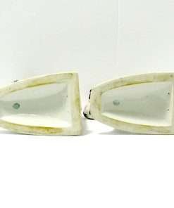 This charming pair of Fox Terrier porcelain bookends were made by the Pfeffer Porcelain Factory in Germany between 1900 – 1934. They are in excellent condition and each one measures approximately 6″ tall x 6″ long x 4″ wide. Each one is posing in a slightly different way and that makes them seem even more realistic. They have a beautiful, muted coloring of two-tone soft gray against bright white with a touch of black. Their expressions appear focused on a specific object of interest, which adds to the story one could create about this engaging pair of pups. Each one is well-marked with the Pfeffer Porcelain stamp on the undersides of their bases.