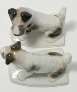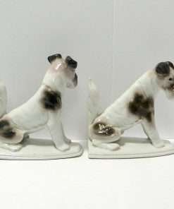 This charming pair of Fox Terrier porcelain bookends were made by the Pfeffer Porcelain Factory in Germany between 1900 – 1934. They are in excellent condition and each one measures approximately 6″ tall x 6″ long x 4″ wide.