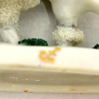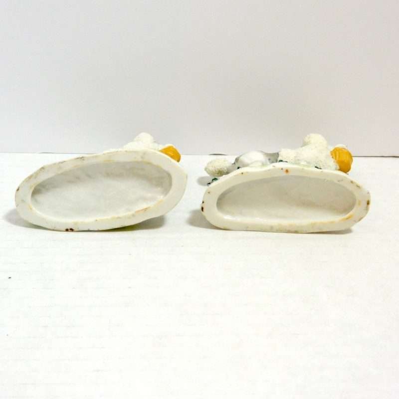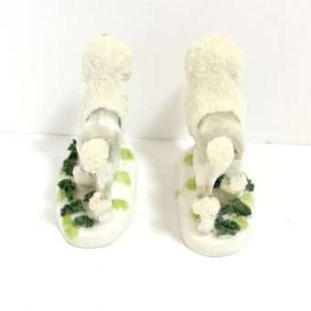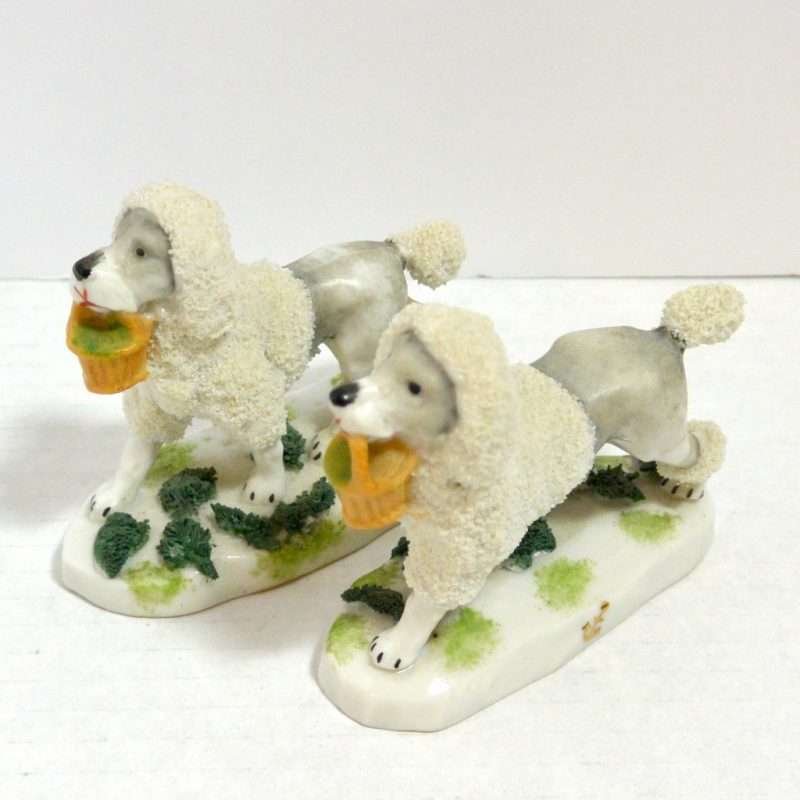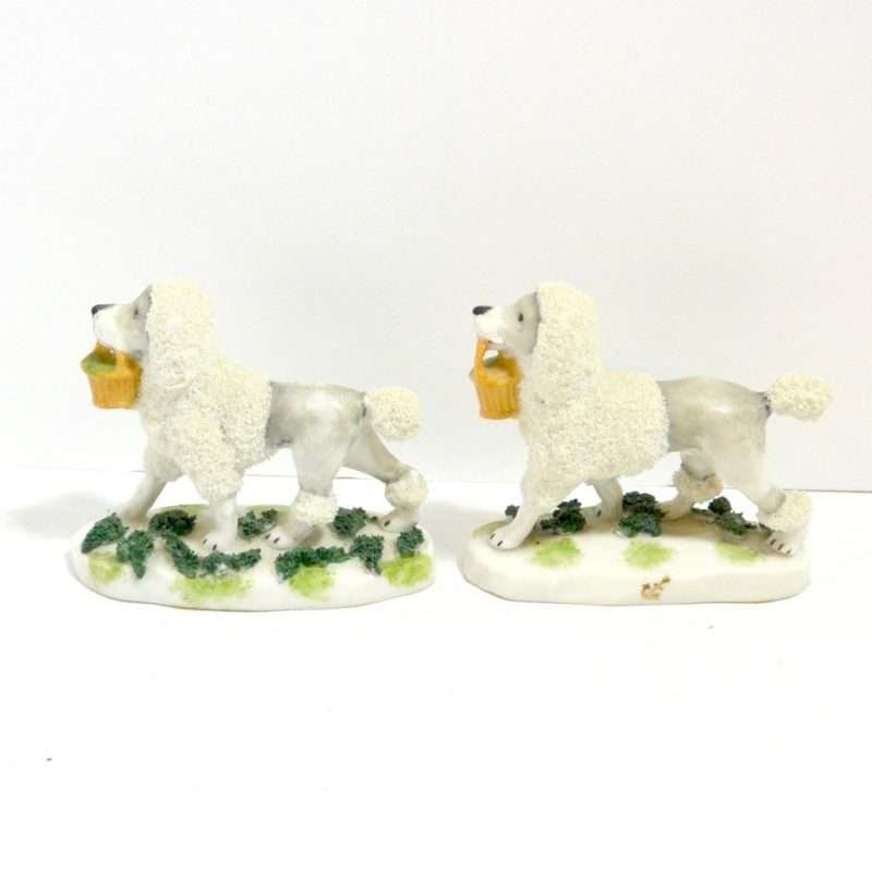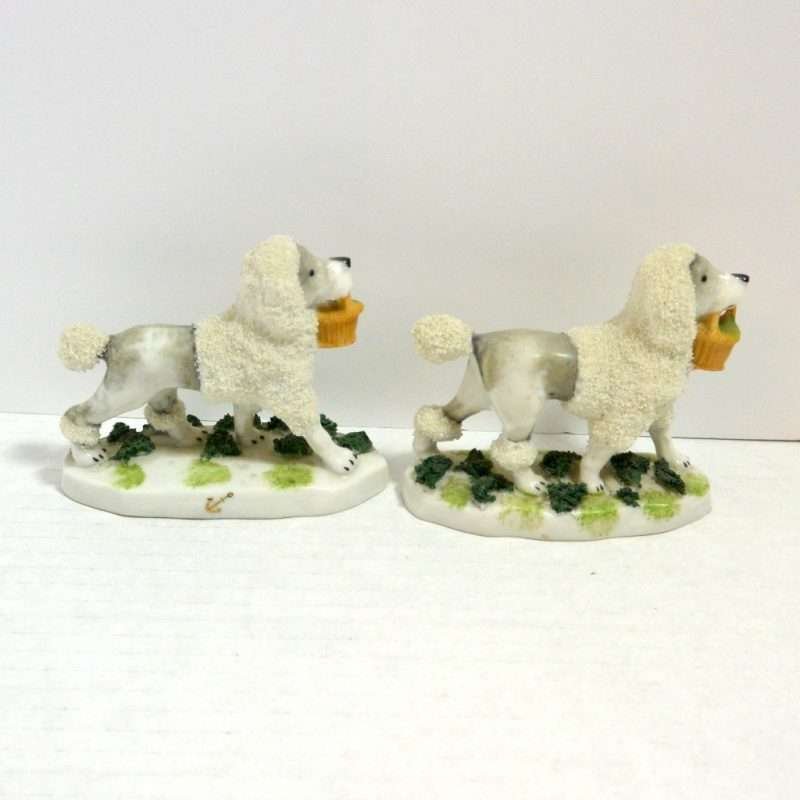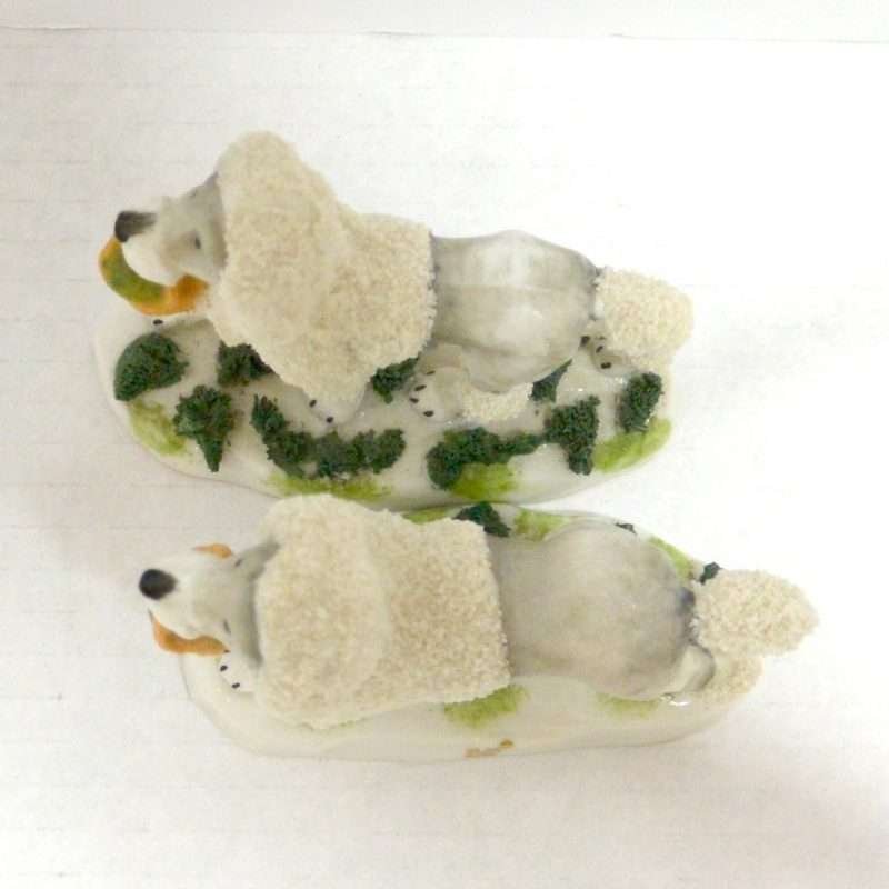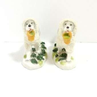 This pair of Staffordshire Poodle dogs is absolutely exquisite. Standing 3″ tall x 3 1/2″ long x 1 1/4″ wide, they are highly and colorfully detailed from the soft grey coloring of their bodies in contrast to the bright white abundance of curly fur that surrounds their heads, tails and legs.