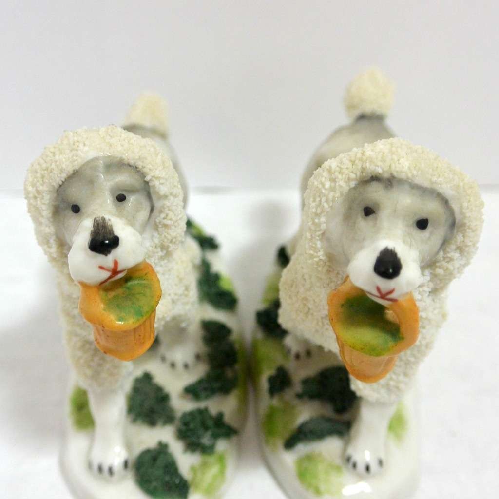 This pair of Staffordshire Poodle dogs is absolutely exquisite. Standing 3″ tall x 3 1/2″ long x 1 1/4″ wide, they are highly and colorfully detailed from the soft grey coloring of their bodies in contrast to the bright white abundance of curly fur that surrounds their heads, tails and legs.