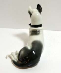 This gorgeous, porcelain figurine of a Rat Terrier shows off all the wonderful distinguishing characteristics of this amazing dog breed. Reclining at a full 10 1/2″ long x 5 1/2″ tall x 4″ wide, he is in excellent condition. His relaxed, but formal pose, with his front paws crossed, his back legs tucked to one side, his head held high with his eyes cast down, gives him a look that is both loving and elegant. He has a number incised on the underside of his body, but it is so faint, it is difficult to read. Figurines of Rat Terriers are difficult to find, and this one is perfect! He would make a beautiful focal piece in any porcelain canine collection. If you love and own a Rat Terrier, this is a rare chance to own such an inspired tribute to the breed.