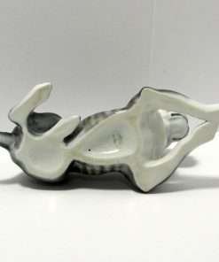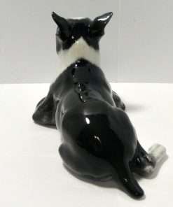 This wonderful Rosenthal Boston Terrier dog figurine is every bit the model of his handsome, intelligent, and loving flesh and fur counterpart. This very popular breed originated in the USA and is often called the “American Gentleman.” Lying elegantly with his smart black and white coat, you can certainly tell why. He was designed in the 1890’s by Fritz Heindenreich, and this figurine was made up through the end of the 1950’s. He is artist-signed along the side of his body, but the only portion that can still be seen is the end of Heindenreich’s name. He measures a full 8 3/4″ long x 4 1/2″ tall x 3 3/8″ wide and he is in excellent condition. His bold, black and white colors vary with lighter and darker glaze, which gives a beautiful definition and texture to his fur.