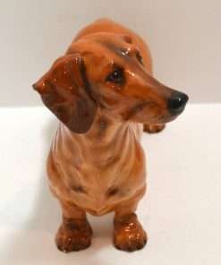 This charming Dachshund dog figurine was designed by Frederick Daws, for Royal Doulton in 1937, and was retired in 1968. He is in excellent condition, and so beautifully detailed and painted, that you can tell by his pose and by his focused expression, that he is indeed that breed of dog that demands to be in on everything that’s going on around him. This exquisite dog will certainly become a favorite of all Dachshund enthusiasts, whether they are collectors, or simply want to make this wonderful dog a treasured addition to their home.
