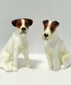 These sweet, “best friends”, porcelain Fox Terrier and Jack Russell Terrier pups came to us as a pair, and we would like to see them kept that way. They were made by Royal Doulton between 1931 – 1977, and they are marked K8 and K7 along with the Royal Doulton factory mark. The Fox Terrier pup measures 2 1/2″ tall x 2 1/2″ long x 3/4″ wide. The Jack Russell Terrier pup measures 2 1/4″ tall x 2 ” long x 1 1/2″ wide. Both are in excellent condition, and this engaging pair would make a wonderful addition to a Royal Doulton canine collection, or a unique and generous gift to your favorite canine enthusiast.