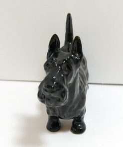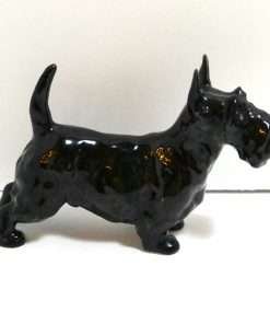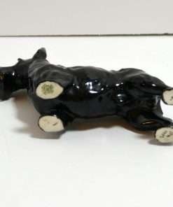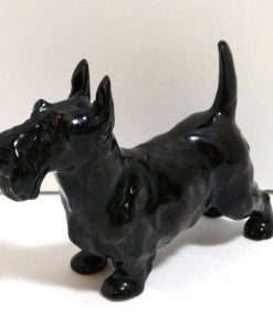 This wonderful, Royal Doulton Scottish Terrier was modeled after Ch Albourne Arthur from the Champion Dog series, and designed by Frederick Daws. He was produced by Royal Doullton between 1931-1985. At 3 1/2″ tall x 5″ long x 1 1/2″ wide, he stands as though he is in a show-ring.