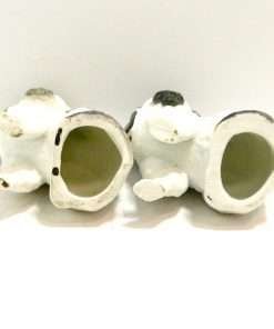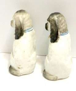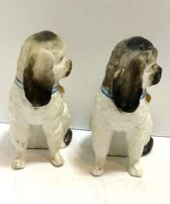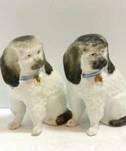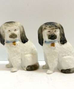 These small, but exquisite dogs date back to the mid-1800’s. Made in the Staffordshire region of England, these figurines were most likely intended to represent a Dandie Dinmont Terrier, which was one of the very popular breeds at that time. At 4″ tall x 2 1/2″ long x 1 3/4″ wide, these dogs are in excellent condition with some wear to the gilt on the bells of their collars. While the appeal of Staffordshire figurines are in their charming folk style, depicting everyday life in the English countryside, they also add a very elegant and more formal touch to the decor of a dining room, or even a master bedroom. Place these dogs next to a bowl of roses, and you are immediately drawn into the feeling of an afternoon tea at a country estate!
