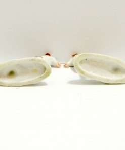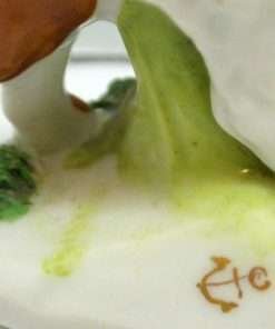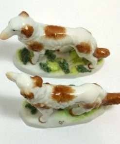 This pair of Staffordshire Borzoi dogs is absolutely exquisite. Standing 3″ tall x 3 1/2″ long x 1 1/4″ wide, they are highly and colorfully detailed with the soft brown and bright white coloring of their bodies, showing off an abundance curly fur lines. Likewise the “ground” at the base of each figurine has both dark green tufts of moss, as well as a much softer, pastel green shading of grass. They are each marked with a gold, gilded anchor, which is considered a “decorator’s mark” and places them as coming from either a Dresden or Berlin, Germany factory ca 1880’s – 1920’s. They are in excellent condition and a truly special find.