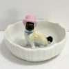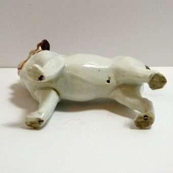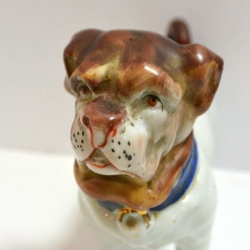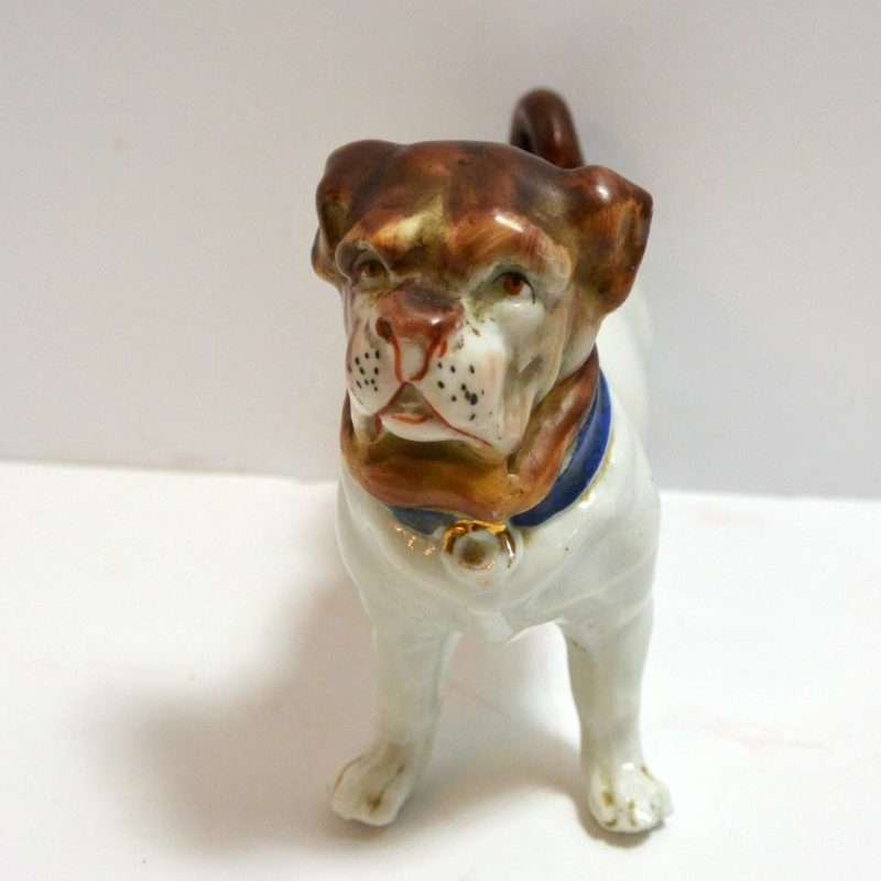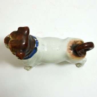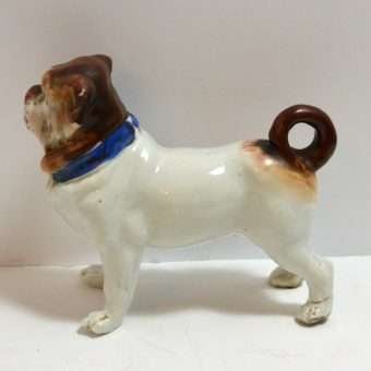 This magnificent Staffordshire dog appears to be a Pug. He has a beautifully detailed head, face, and blue collar, painted with a matte finish, which gives it a bisque “look.” The same is true of his curled tail. His bright white body, however, is done in a high gloss finish. He is unmarked, but most definitely a quality figurine, standing 4″ tall x 5″ long x 2″ wide. He is in excellent condition. He is so interesting and so engaging, he would make a truly one-of-a-kind addition to your canine collection. If you are a collector of Staffordshire figurines, this unique dog will certainly be an excellent addition to your collection.