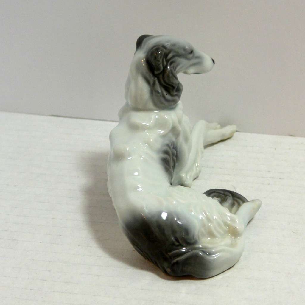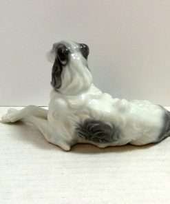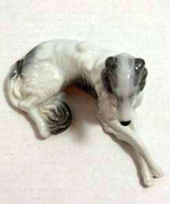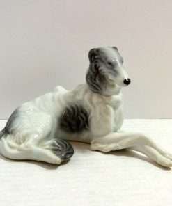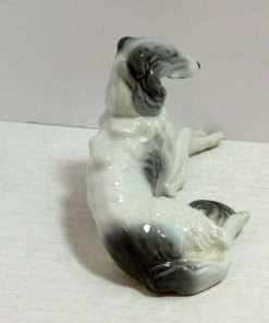 This beautiful, reclining, Borzoi dog would make a wonderful addition to your collection of “Occupied Japan” figurines. In excellent condition, she is 3″ tall x 5 1/4″ long x 2 1/2″ wide. Done in a soft grey and white with an abundance of curling fur lines, she presents a truly elegant picture. Her delicately crossed front legs add to the effect. Unlike many of the dog figurines from the same country and era, which are more whimsical and often comedic-looking, this beauty is very realistic, and meant to capture the refined dignity of the breed. Those who love Borzois/Russian Wolfhounds will want to add this gem to their home decor.