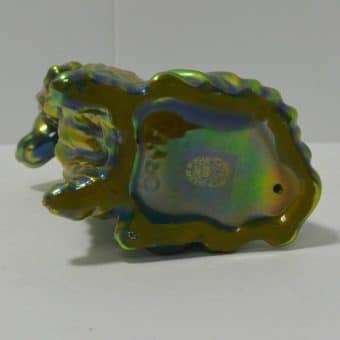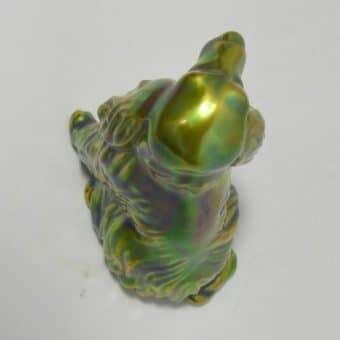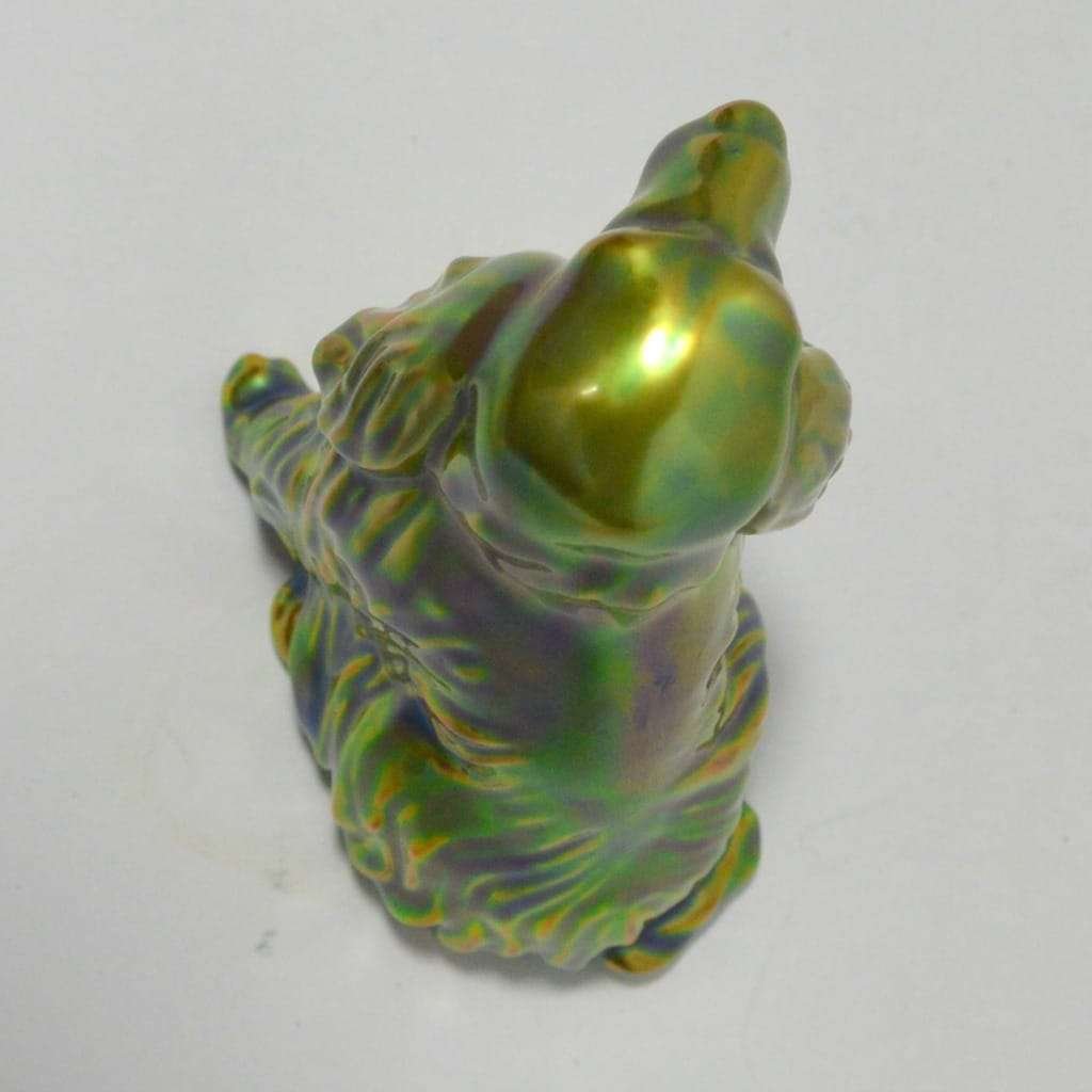 This gorgeous figurine of a Spaniel or Setter dog was created in the Zsolnay factory in Hungary. Its’ unique coloring, a mix of green blue and gold, was achieved by using eosin, which means “the light of the dawn” in Greek. Introduced in 1893, this process uses a glittering ceramic glaze to emphasize certain parts of the figurine with glimmer. This gives the piece an iridescent, metallic look, that has become the unique hallmark of Zsolnay porcelain, animal figurines.