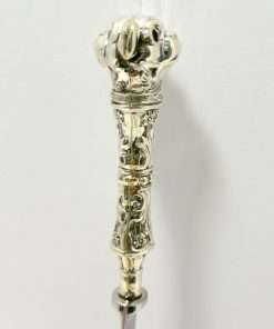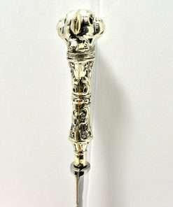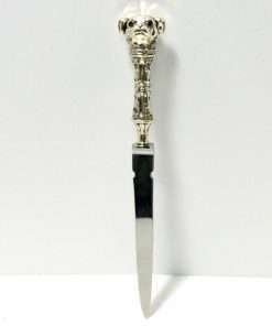 This exquisite, antique, letter opener was made in Birmingham, England in 1906. The handle is sterling silver and bears a two-sided Pug dog head pattern, that is beautifully detailed. The blade is stainless steel with a mirrored finish. The handle is fully hallmarked with an Anchor, the Lion Passant and the date letter “g.” It also shows the maker’s mark “C&N”, which shows that this incredible piece was manufactured by Crisford & Norris. At 9 1/4″ long it is in Mint condition.