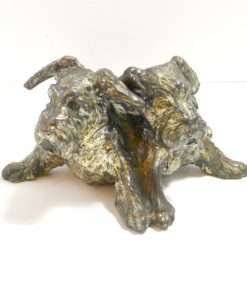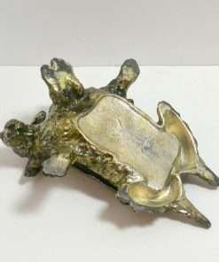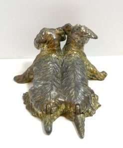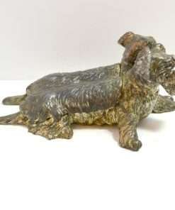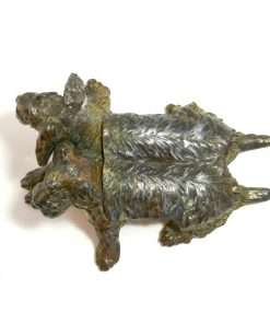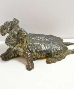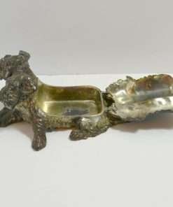 Gorgeous detailing, and tremendous vintage appeal, combine to make this silverplate, hinged cigarette box a one-of-a-kind collectible! These silverplate Scottish Terriers, lying side-by-side open up to a rectangular box that may have once been used to hold cigarettes. The silverplate is very worn, and if you were to have it re-silvered, it would look extraordinary, but we will leave that decision to you because we love its charm and vintage look just the way it is. If you are a Scottie owner, this piece is a once-in-a-lifetime find! It can easily be re-purposed as a trinket box, a jewelry box, or a desk caddy. These pups are 4″ tall x 7″ long x 6″ wide. Other than the loss of silver plate, they are in excellent condition.