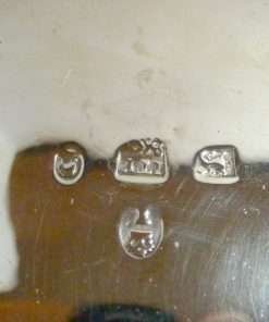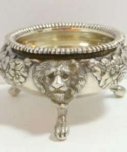 Each of these exquisite, sterling silver open salts feature both ornate floral and leaf designs, as well as three lion’s legs, paws, and heads. Their interiors are sterling and each salt is in outstanding condition. They do not have any monograms, and they have not been repaired or machine polished. This George II lion design was made in 1810, and each piece is well-hallmarked. They are each 2″ tall, with a 3″ diameter. Their age combined with their excellent condition and extraordinary detailing, make this pair truly a treasure worth adding to your British Sterling Silver collection.