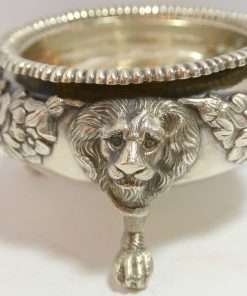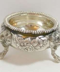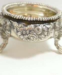 Each of these exquisite, sterling silver open salts feature both ornate floral and leaf designs, as well as three lion’s legs, paws, and heads. Their interiors are sterling and each salt is in outstanding condition.