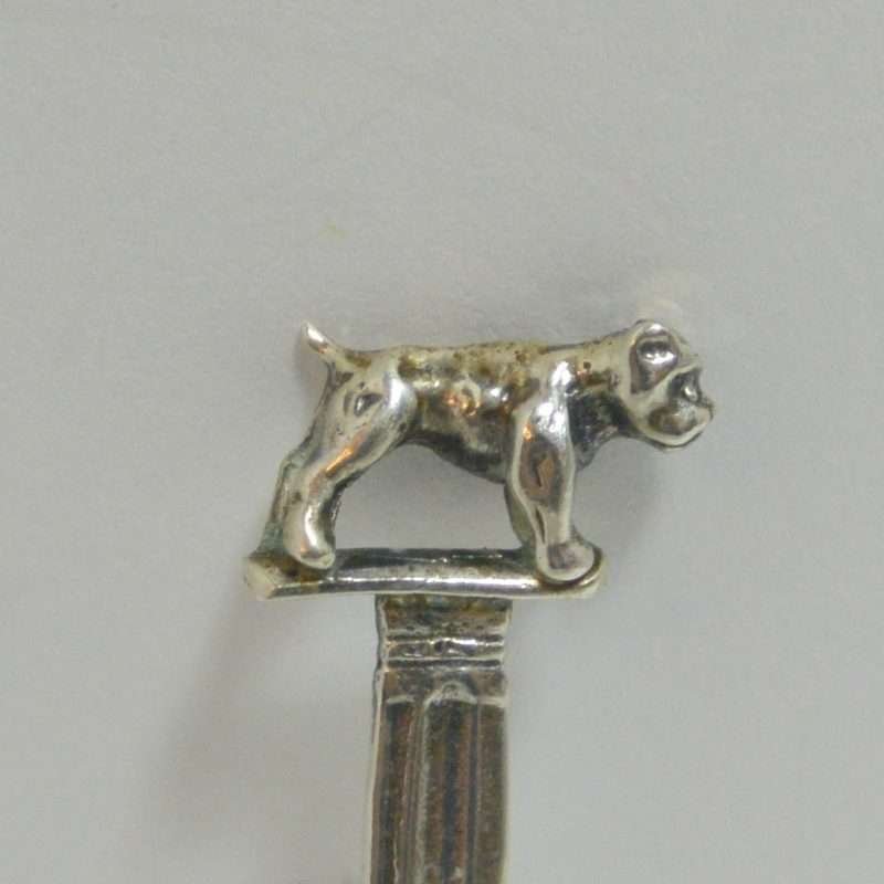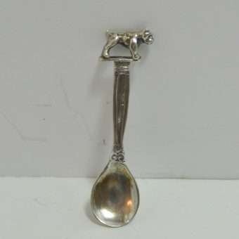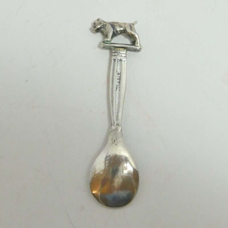 Tiny but exquisite, this sterling silver salt spoon is beautifully detailed with a standing dog as a finial. It is 2″ long, and the bowl of the spoon is 1/2 in diameter. It is marked Sterling on the back. It is in excellent condition, and it would look wonderful polished, but we want to leave that decision up to you. It would make a perfect addition to a spoon collection, or a unique “stocking stuffer” for your favorite dog-lover!