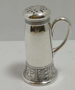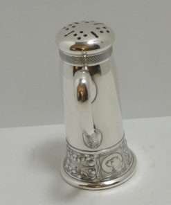 It has a removable lid that has a finely wrought basketweave design along its edge. It also has a graceful handle that distinguishes it from most commonly seen sugar castors.