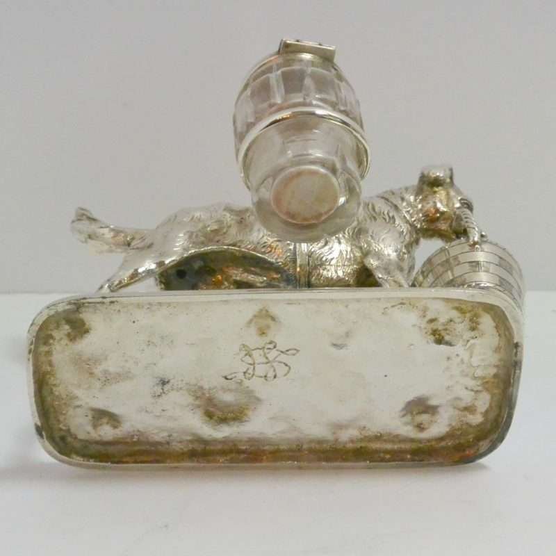 This antique, silverplate, cruet set includes a silver-topped, cut glass salt cellar and a pepper shaker, and a gorgeous figurine of a dog carrying a woven basket in his mouth. Dating back to 1835, it is truly a uniquely elegant piece, and it is in excellent condition. It is 6″ tall x 5 1/4″ long x 2 1/4″ wide. The detailing is extraordinary, from the abundance of fur lines on the dog to the beautiful collar he is wearing, to the elaborate woven basket. This is truly an amazing find for anyone who appreciates fine silver work, and also loves dogs!