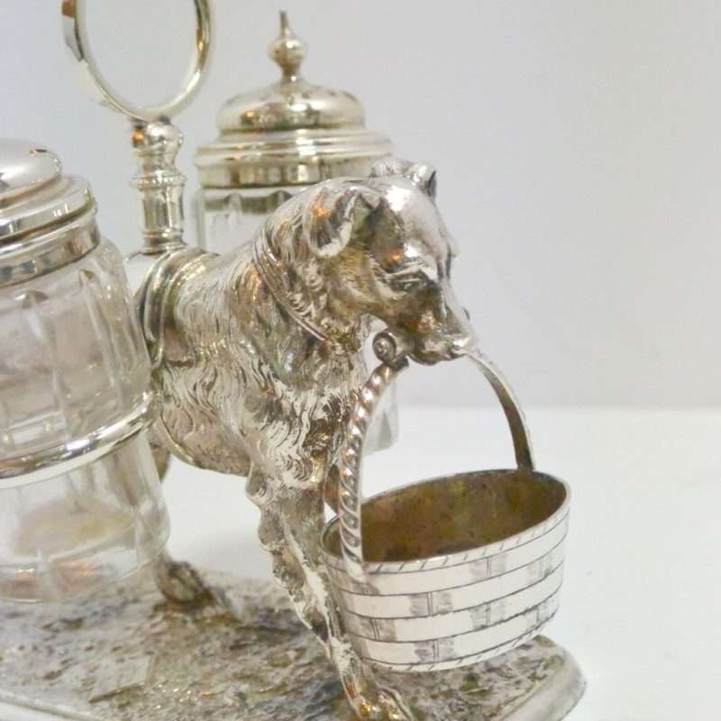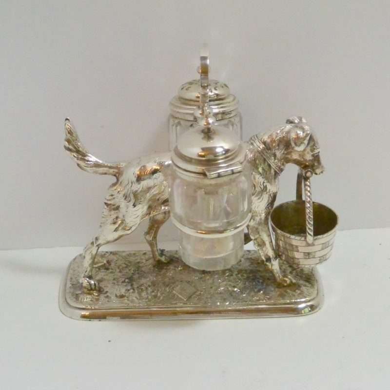 This antique, silverplate, cruet set includes a silver-topped, cut glass salt cellar and a pepper shaker, and a gorgeous figurine of a dog carrying a woven basket in his mouth.